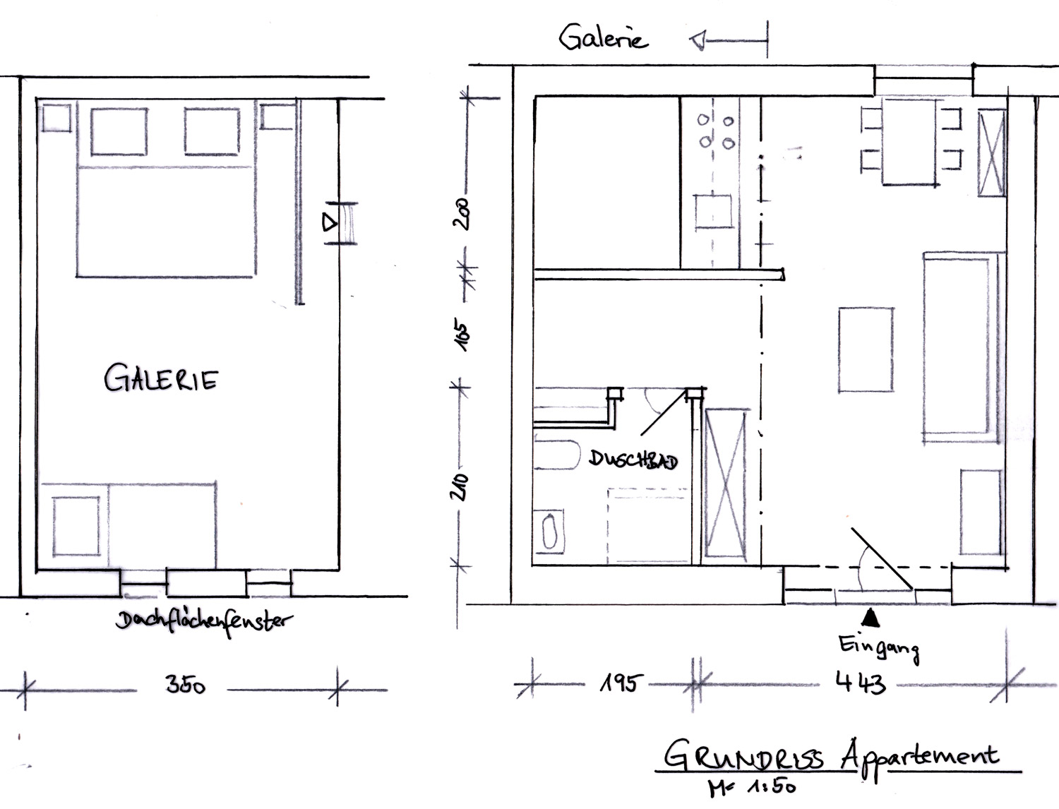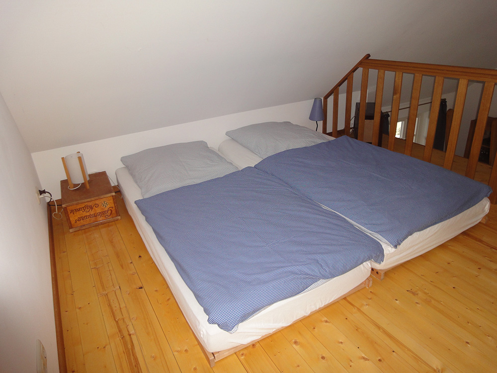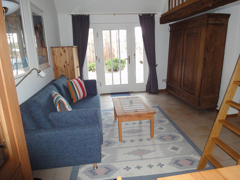 Kernstück des Wohnbereiches bildet das Sofa, das sich für die Nacht zum 2x2m großen Bett umbauen lässt. Der Fernseher (Sat.) mit DVD-Player versteckt sich im alten Bauernschrank. Alternativ zum Schlafsofa können Sie über eine Leiter zur Galerie klettern, wo Sie zusätzliche Schlafmöglichkeiten vorfinden. Im Wohnraum finden Sie eine Kochnische mit E-Herd und Backofen, Kühlschrank, Kaffeemaschine, Wasserkocher und Toaster, sowie Geschirr, Besteck, Töpfe, Bratpfannen etc. Die Mahlzeiten können sie am Esstisch einnehmen. Selbstverständlich sind die Betten frisch bezogen und Frottierwäsche, sowie Geschirrtücher vorhanden.