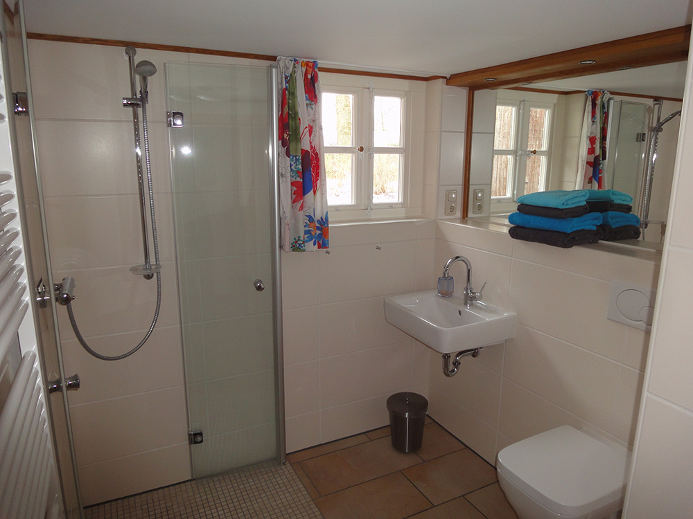 Das Badezimmer ist mit Waschbecken, WC und Dusche ausgestattet. Diese ist ebenerdig mit Bodenablauf gebaut. Ein Föhn liegt für Sie bereit.