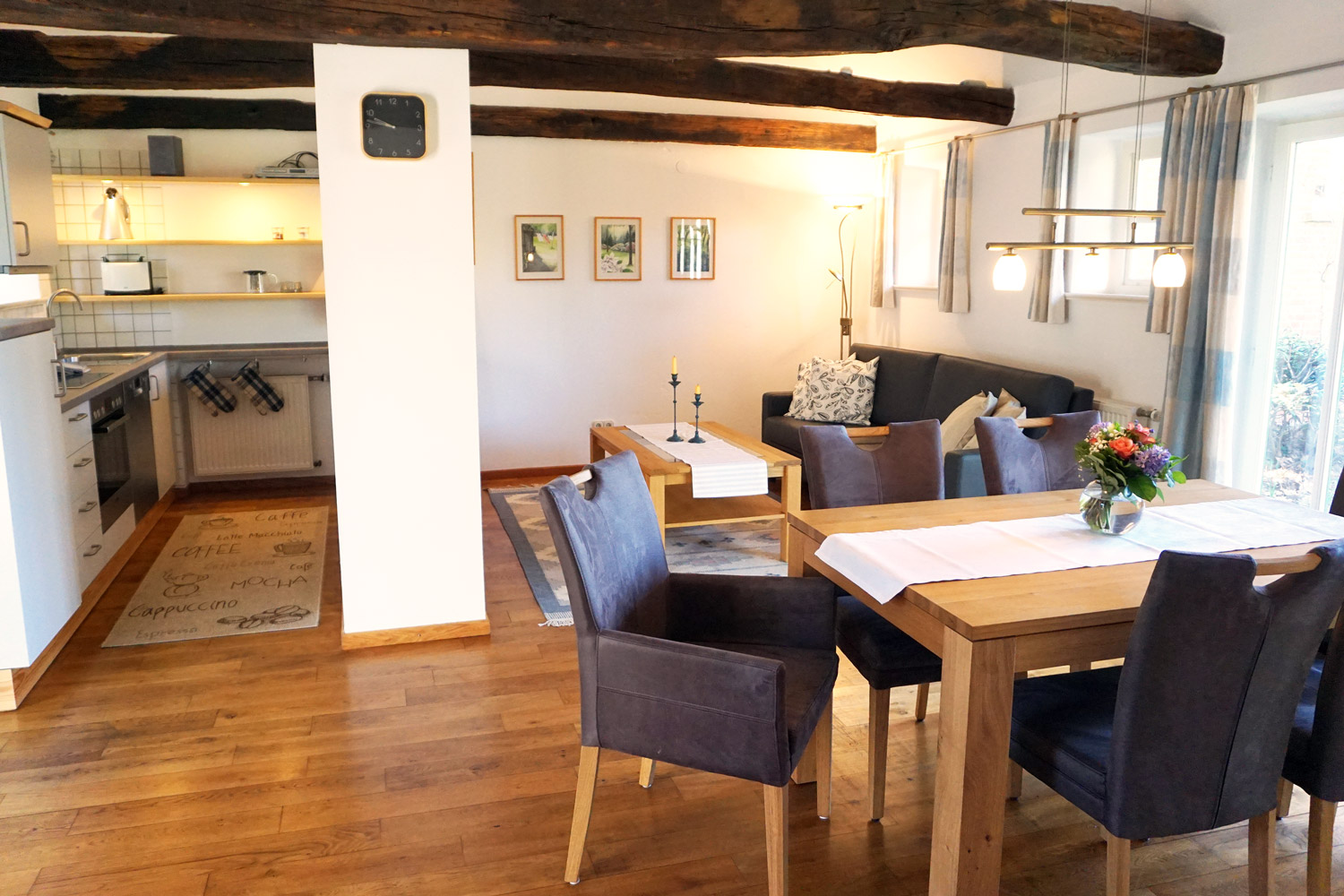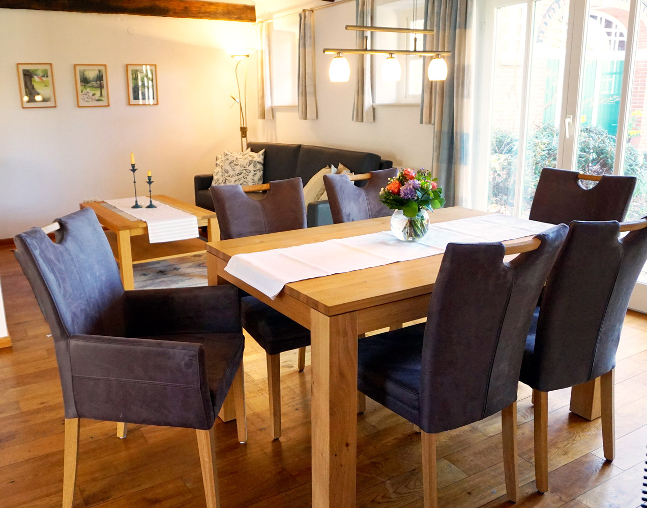 Herzstück der Ferienwohnung ist der große Wohnbereich. Er ist offen gehalten, durch die sichtbare Balkenkonstruktion kann man bis in die Dachschräge hinaufsehen. Hier finden Sie auch den Essplatz für bis zu 8 Personen mit Blick auf unsere Gänsewiese, sowie eine gemütliche Sofaecke mit Fernseher und HIFI Anlage. Ein Festnetztelefon mit eigener Nummer steht Ihnen während des Aufenthalts zur Verfügung.