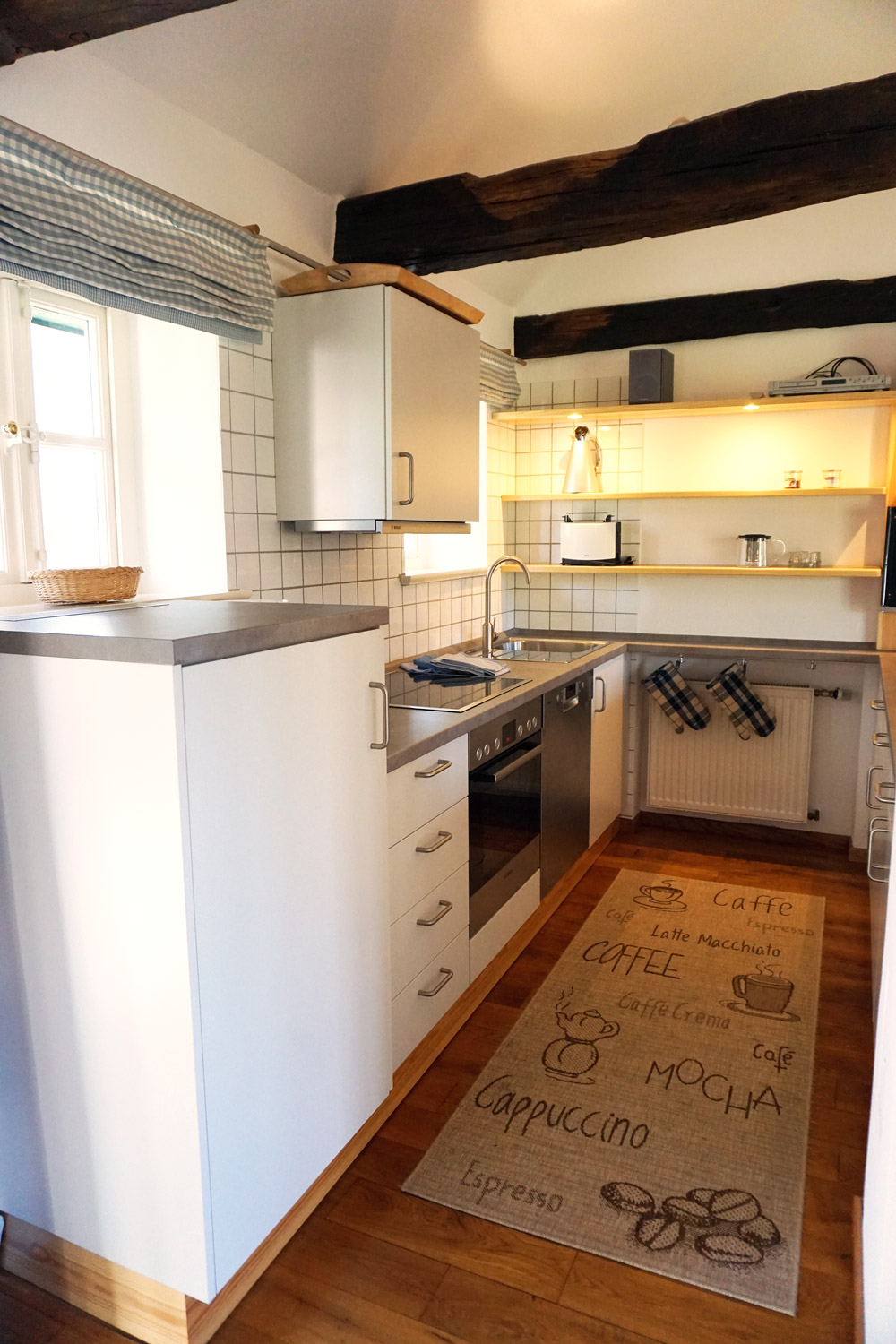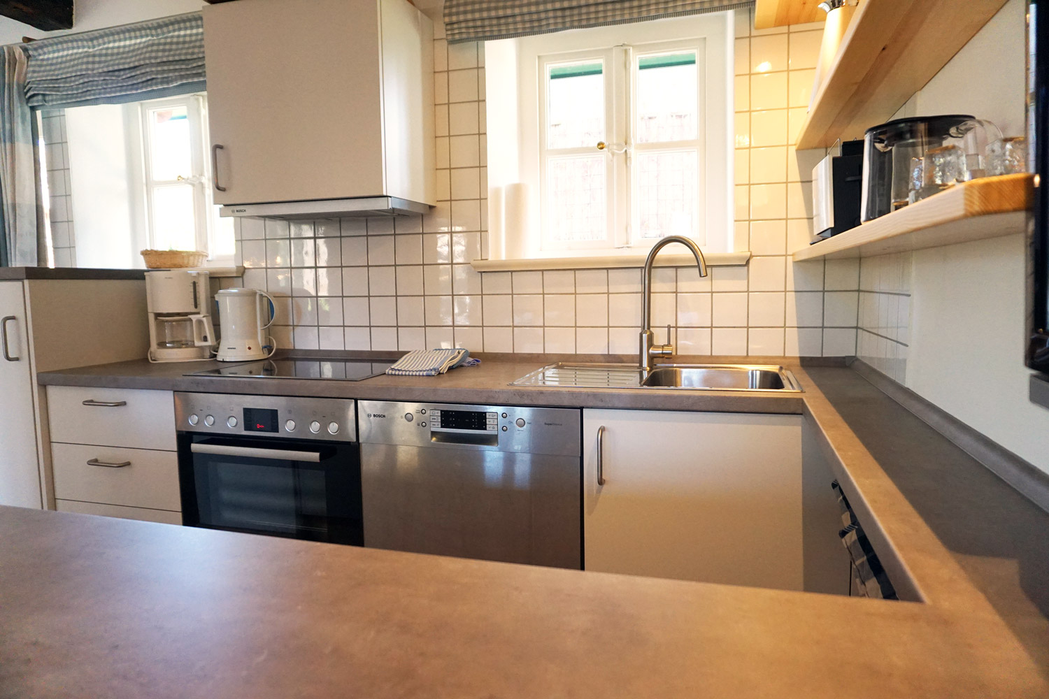 Die 2-zeilige Einbauküche ist in den Wohnraum integriert. Sie ist ausgestattet mit allem, was man braucht: 3-Sterne ***-Kühlschrank, 4-Platten E-Herd mit Dunstabzugshaube, Backofen, Spülmaschine, Mikrowelle, Kaffeemaschine, Wasserkocher, Toaster, Töpfe, Geschirr, Gläser, Besteck sowie sonstige Küchengerätschaften.