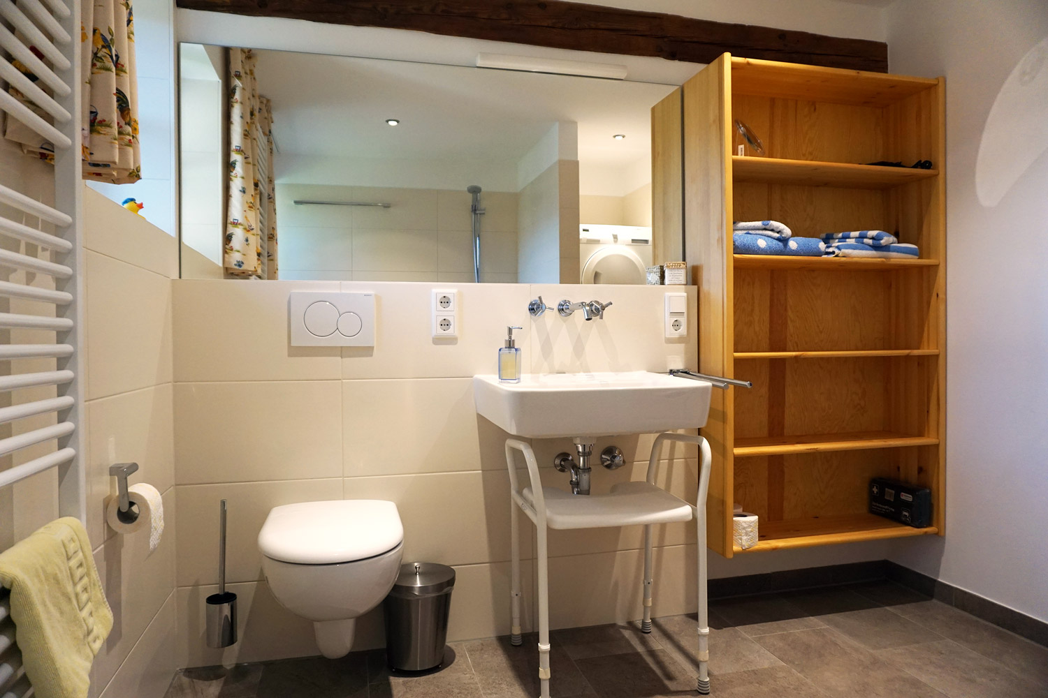 Die Wohnung hat einen separaten Eingang, im dazugehörigen Carport finden Sie neben dem Auto Platz für ihre Fahrräder und Steckdosen zum Aufladen ihrer E-Bikes. Sämtliche Bereiche sind ebenerdig und ohne Stufen und Schwellen erreichbar. Damit kann das Haus auch von gehbehinderten Gästen problemlos genutzt werden.