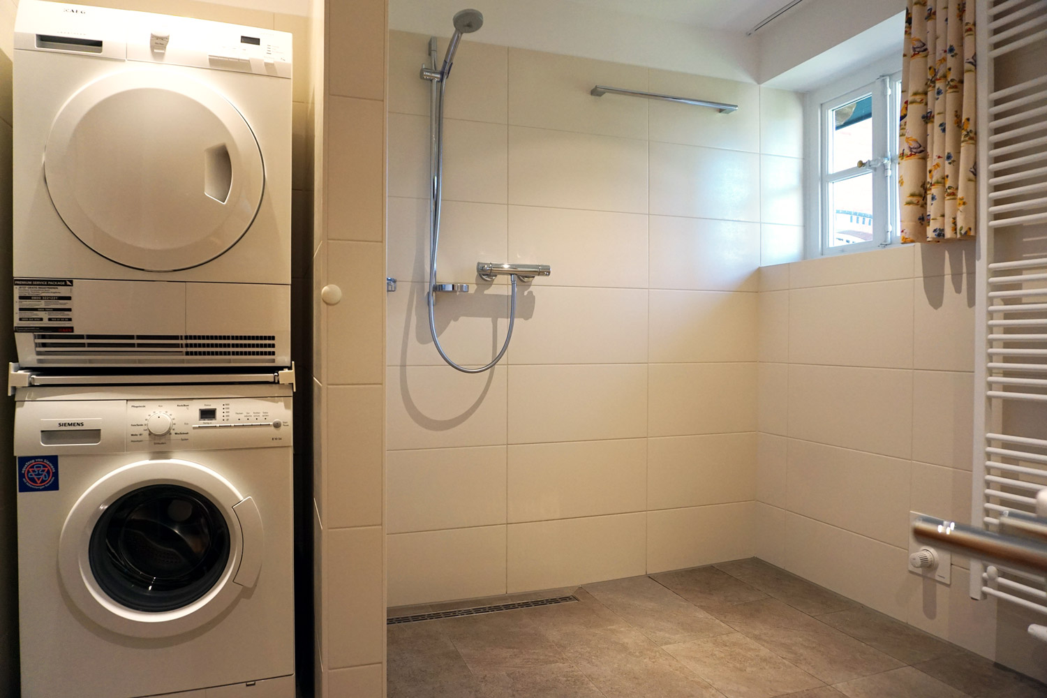 Das Badezimmer ist ausgestattet mit Dusche, WC und Waschbecken. Eine Waschmaschine und einen Trockner finden Sie hier ebenfalls. Fußboden und Wände sind gefließt und der ganze Raum wird mit einer Fußbodenheizung angenehm beheizt. Auch ein Handtuchtrockner und Föhn, sowie frische Handtücher sind vorhanden.