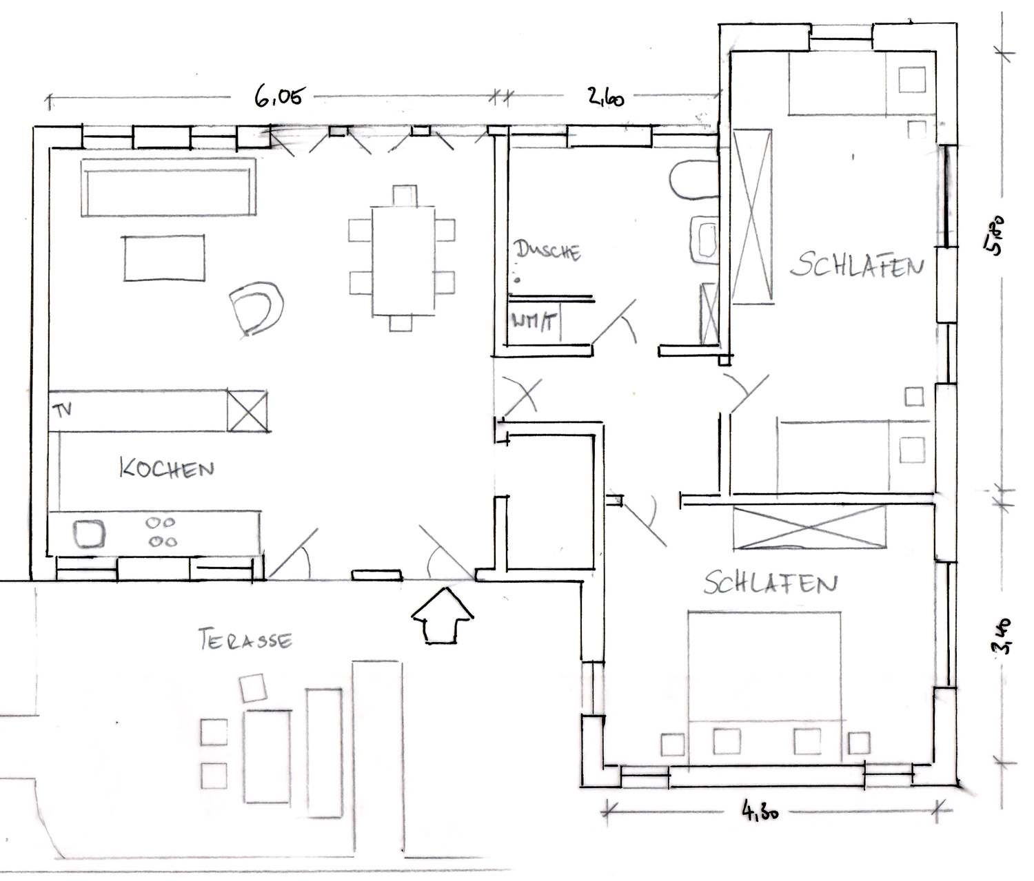 Unsere große Ferienwohnung ist 75 qm groß und bietet viel Platz für 2 Paare oder Familien mit bis zu 4 Kindern. Dazu gehören ein Wohnraum mit Küche, zwei Schlafzimmer (optional mit je einem Zustellbett oder Kinderbett), ein geräumiges Duschbad und ein Abstellraum.